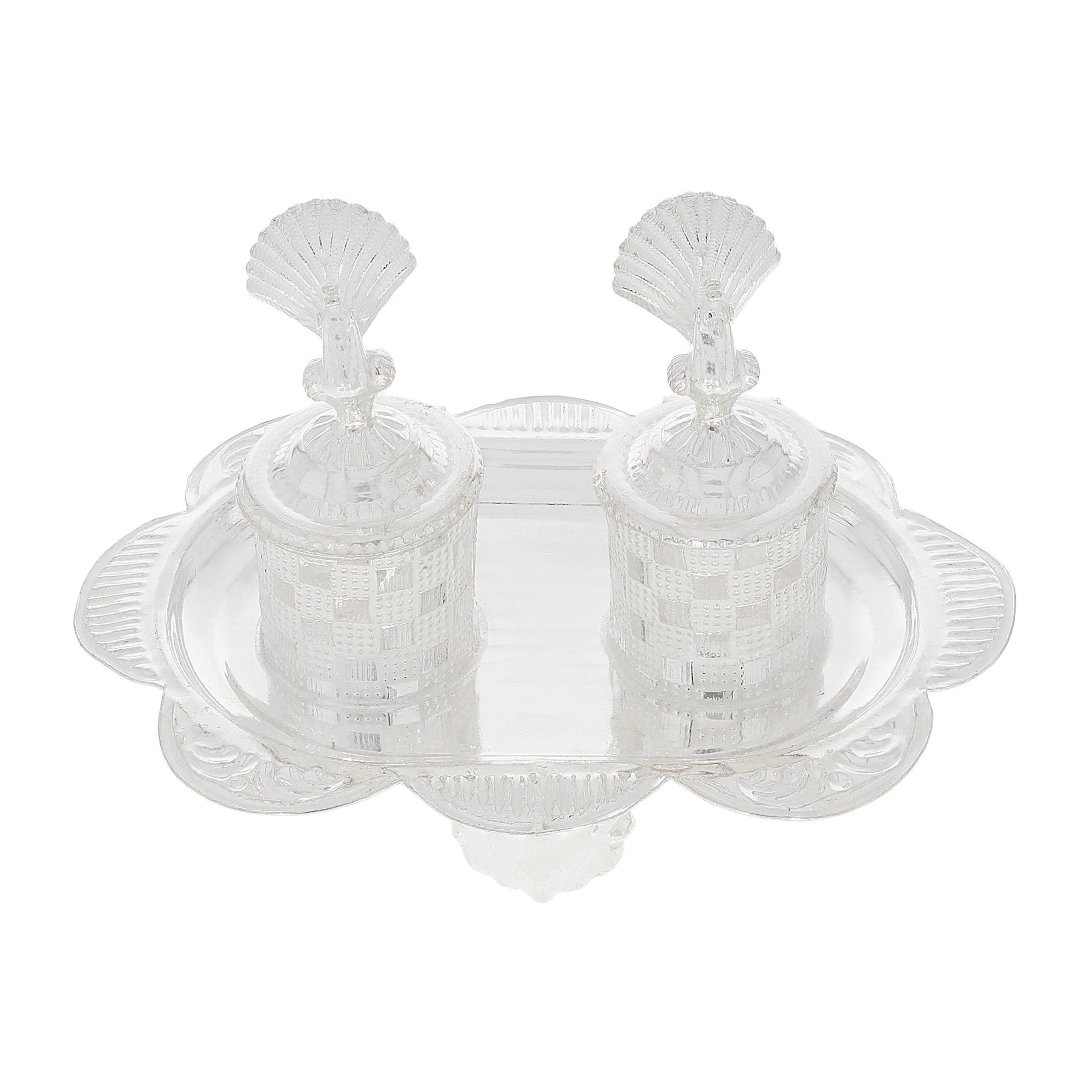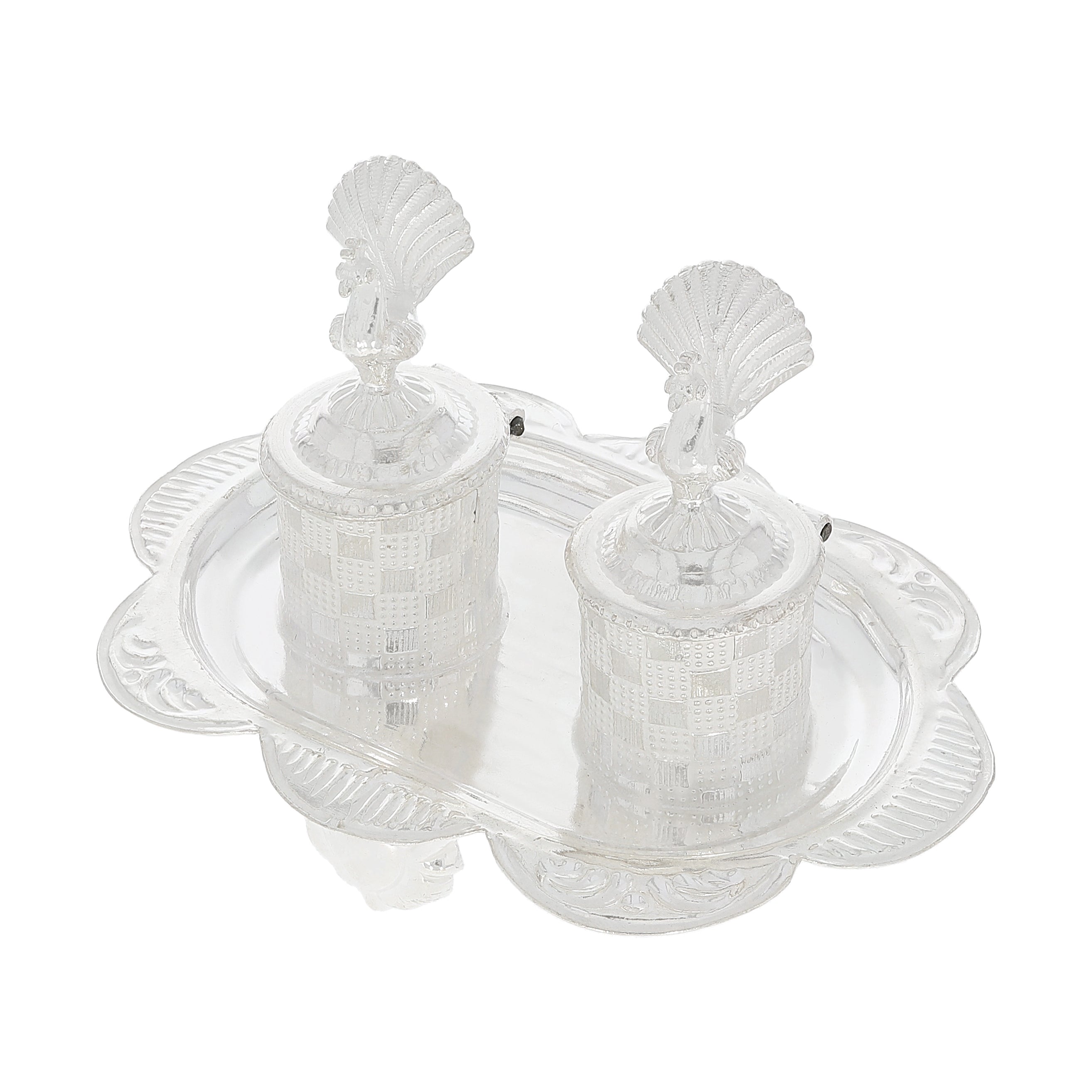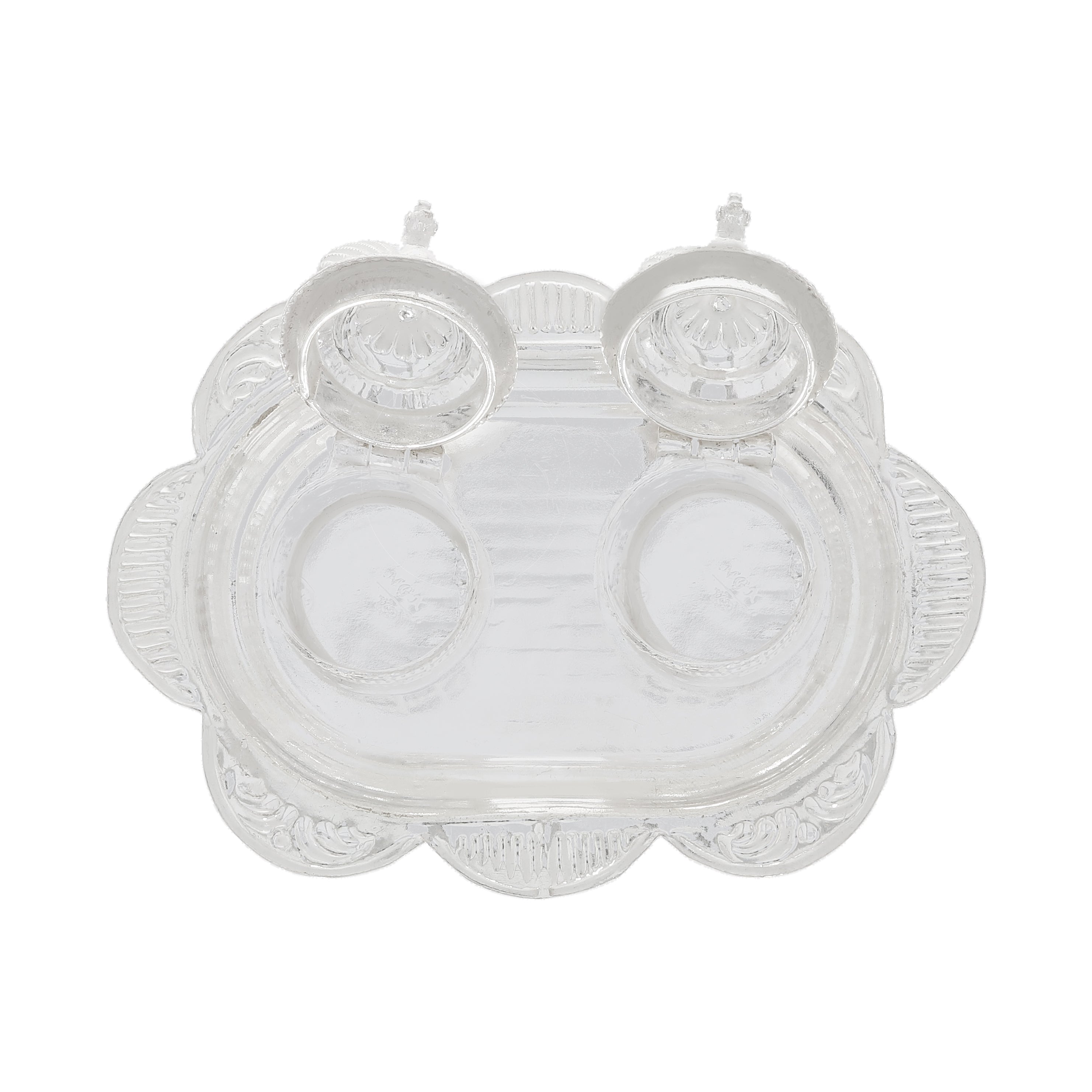 This silver Karanda reflects grizzled radiance and traditional artistry. Ideal for rituals, it enhances offerings with strength, elegance, and devotional richness.