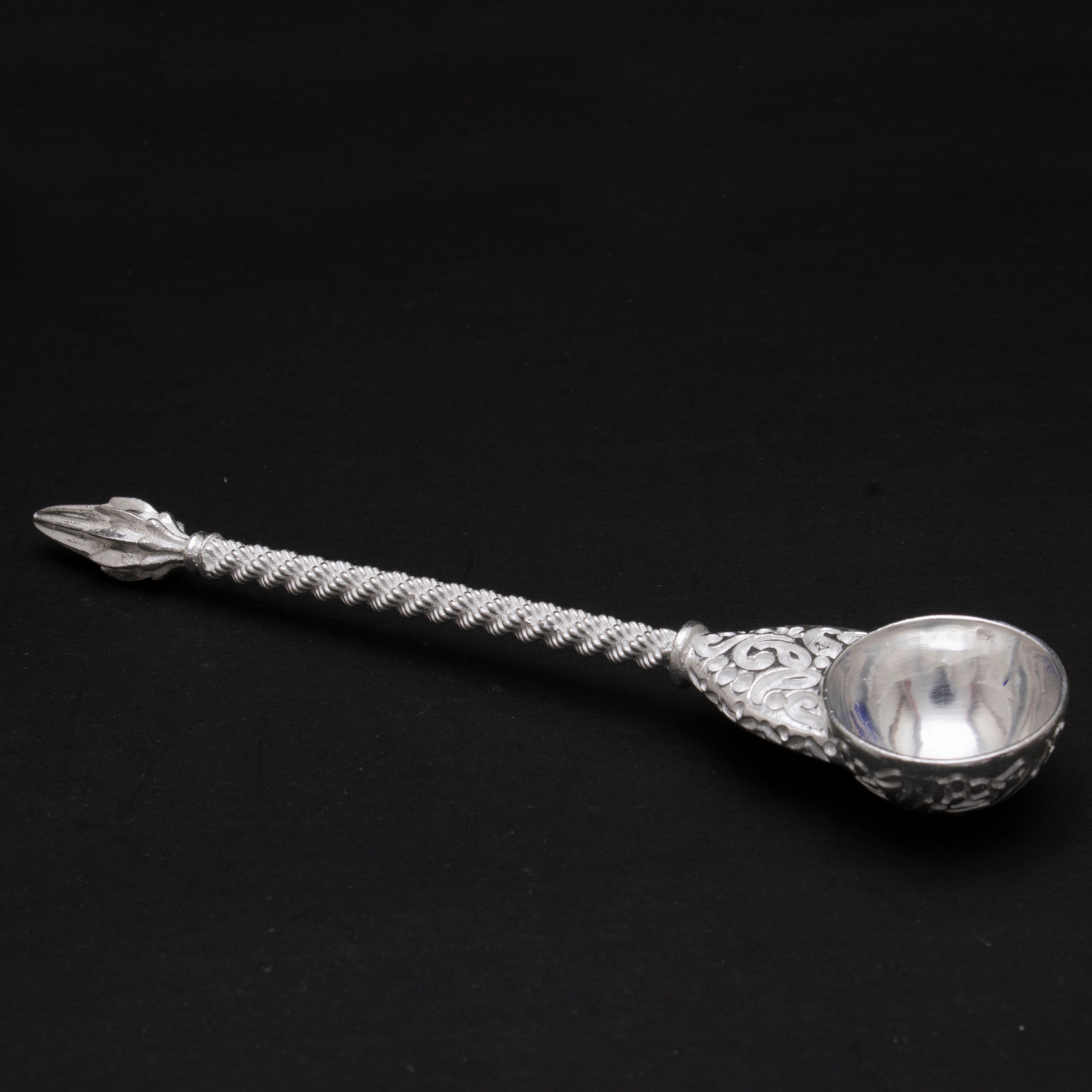 Crafted with captivating twirl patterns, this sterling silver sandhyapali enriches sacred spaces with artistic brilliance.
